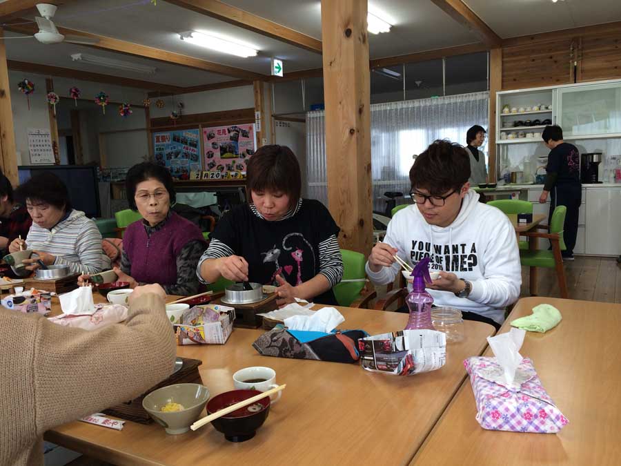 また、仮設住宅の住民の方々との交流や、福島県で被災者支援に取り組む福島大学の学生との勉強会や交流なども実施しました。福島大学の学生さんは「福島大学 災害ボランティアセンター」という学生団体で、震災直後から仮設住宅の方々の交流や健康支援など取り組んできました。最近では、「いるだけ支援」という活動を行っています。「いるだけ支援」とは、学生が仮設住宅に居住することにより、仮設住宅に一緒に住む生活者として簡易な生活支援や声掛けをし、「孤立死・関連死・自殺」をなくすという試みです。我々もいるだけ支援の活動をしている学生さんと合流し、浪江町から二本松市に避難している方々と健康体操や昼 食を通して交流したりしました。また、この時、昨年2016年3月に開催した「福島× 岡山復興【FUKU-O】春フェス」で学生ボランティア、来場者で作成した「起き上がり小法師」のオブジェをお渡しさせていただきました。(写真画像はクリックすると大きくなります)
